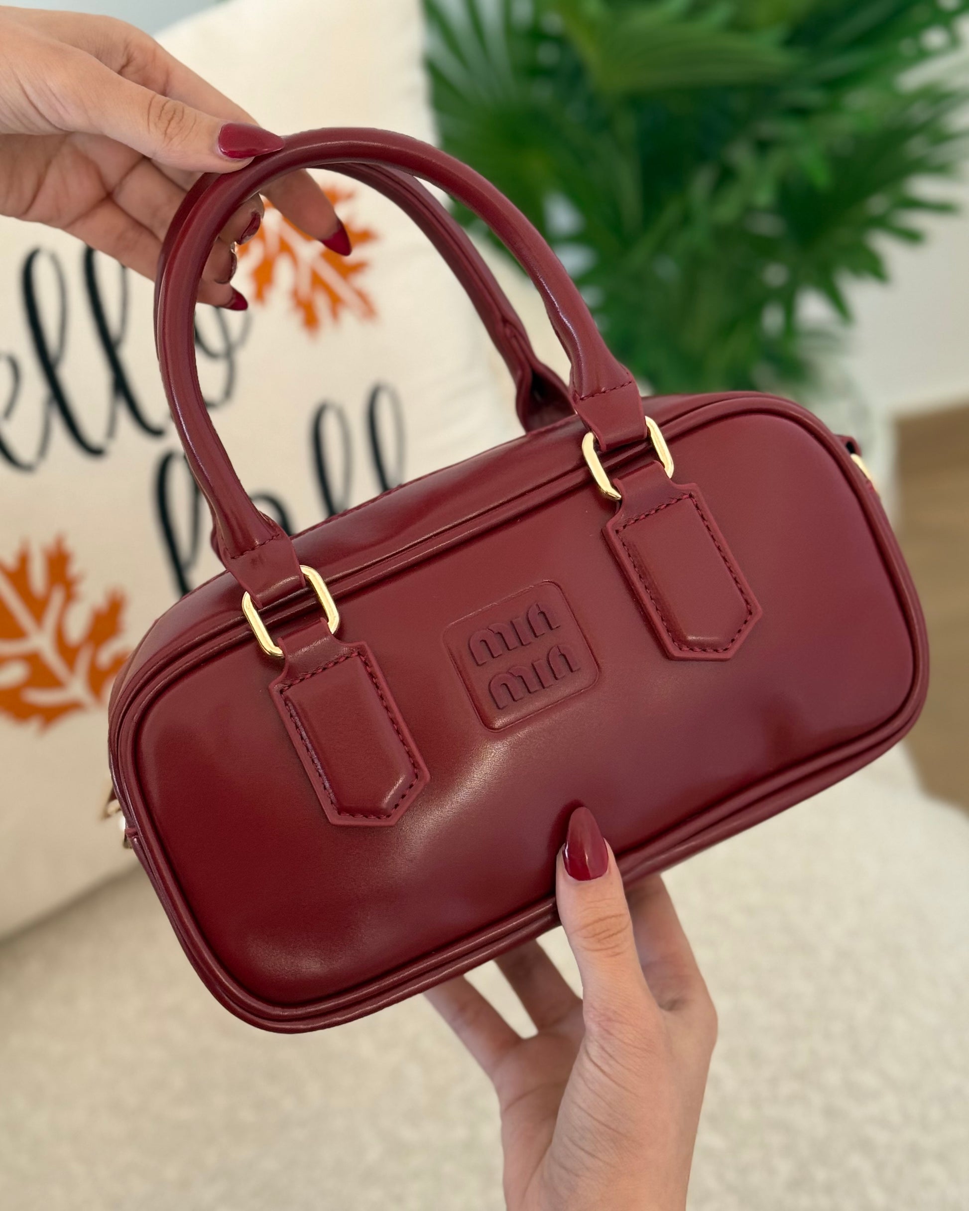 . C’est un sac bowling compact en cuir lisse bordeaux au design minimaliste.