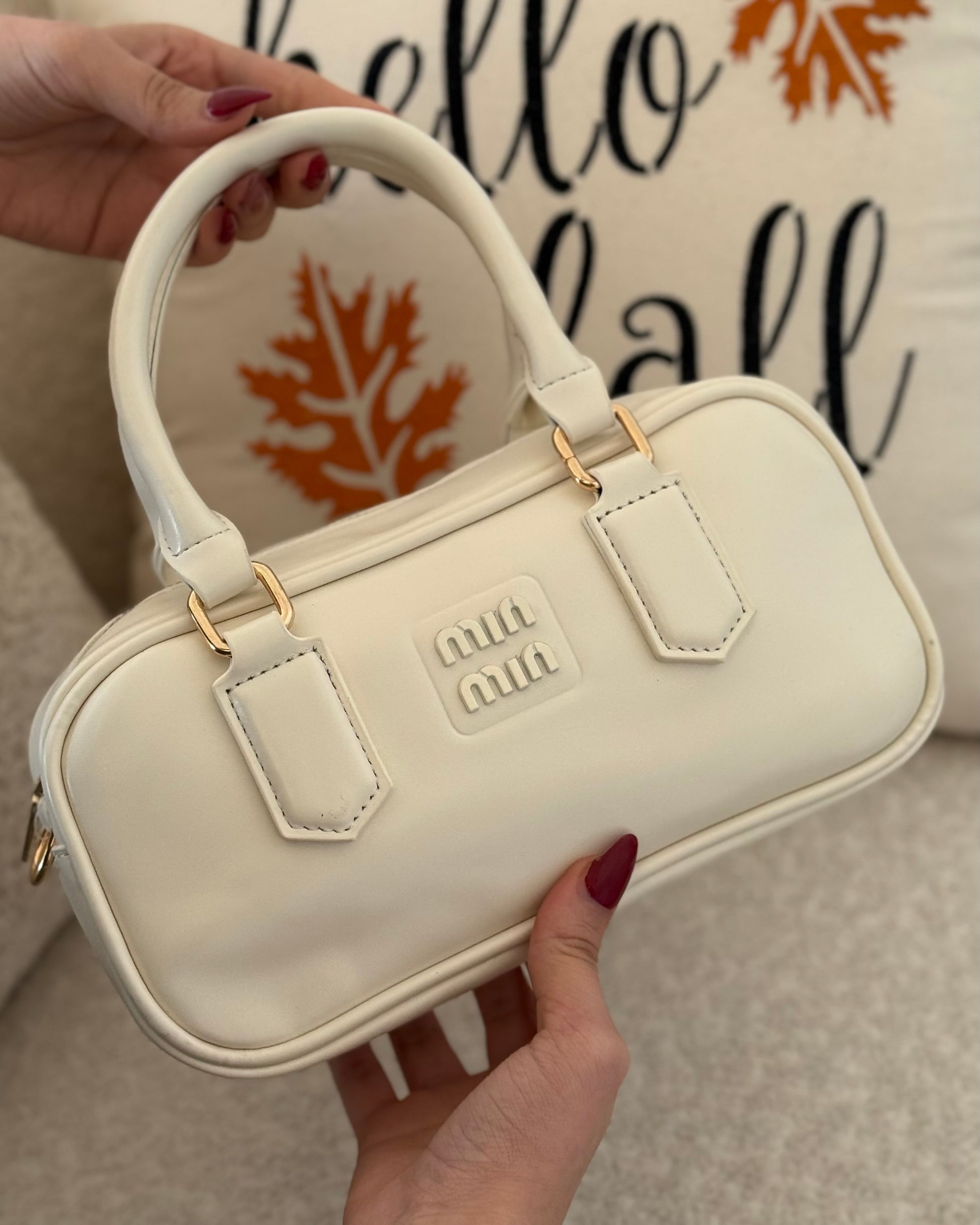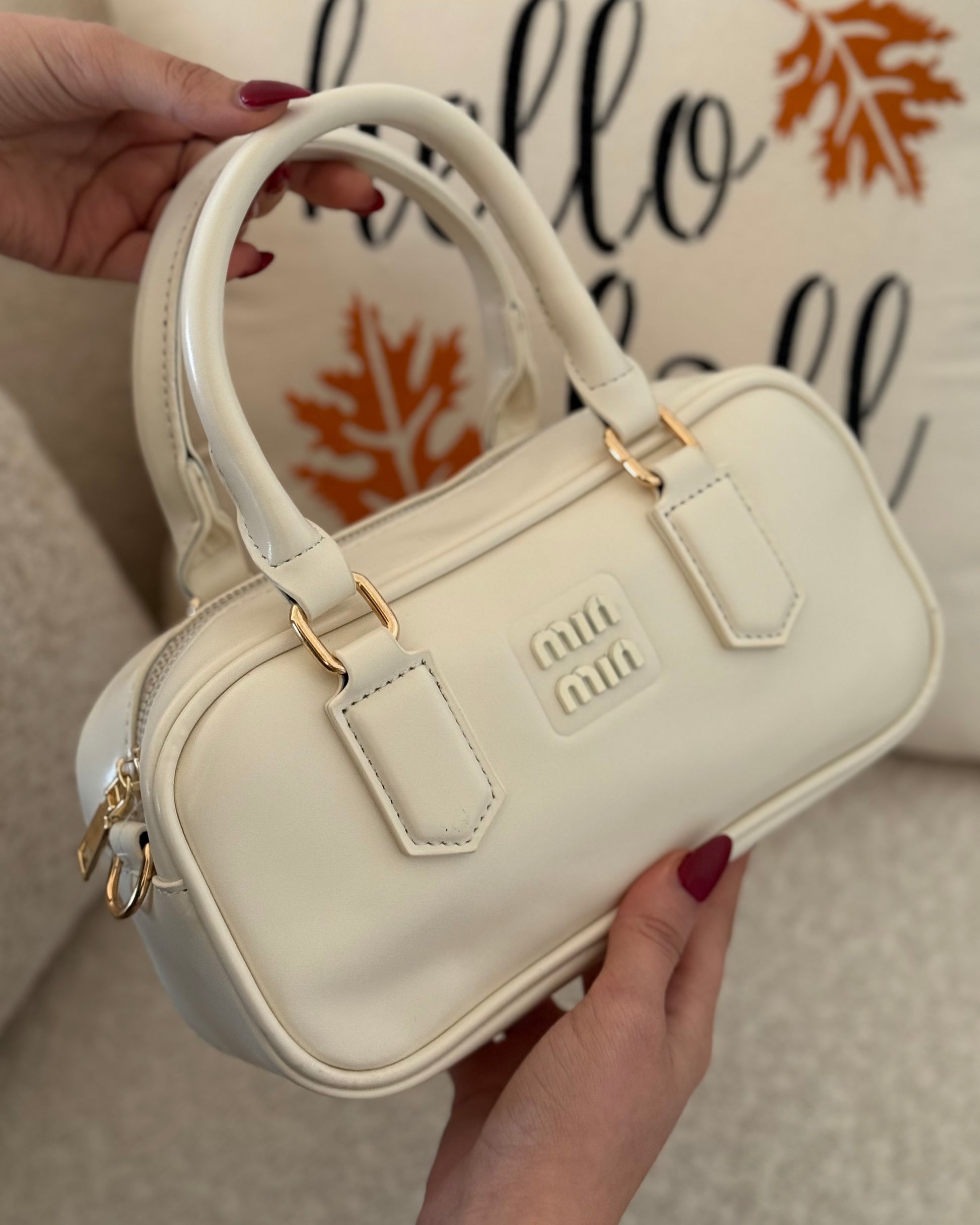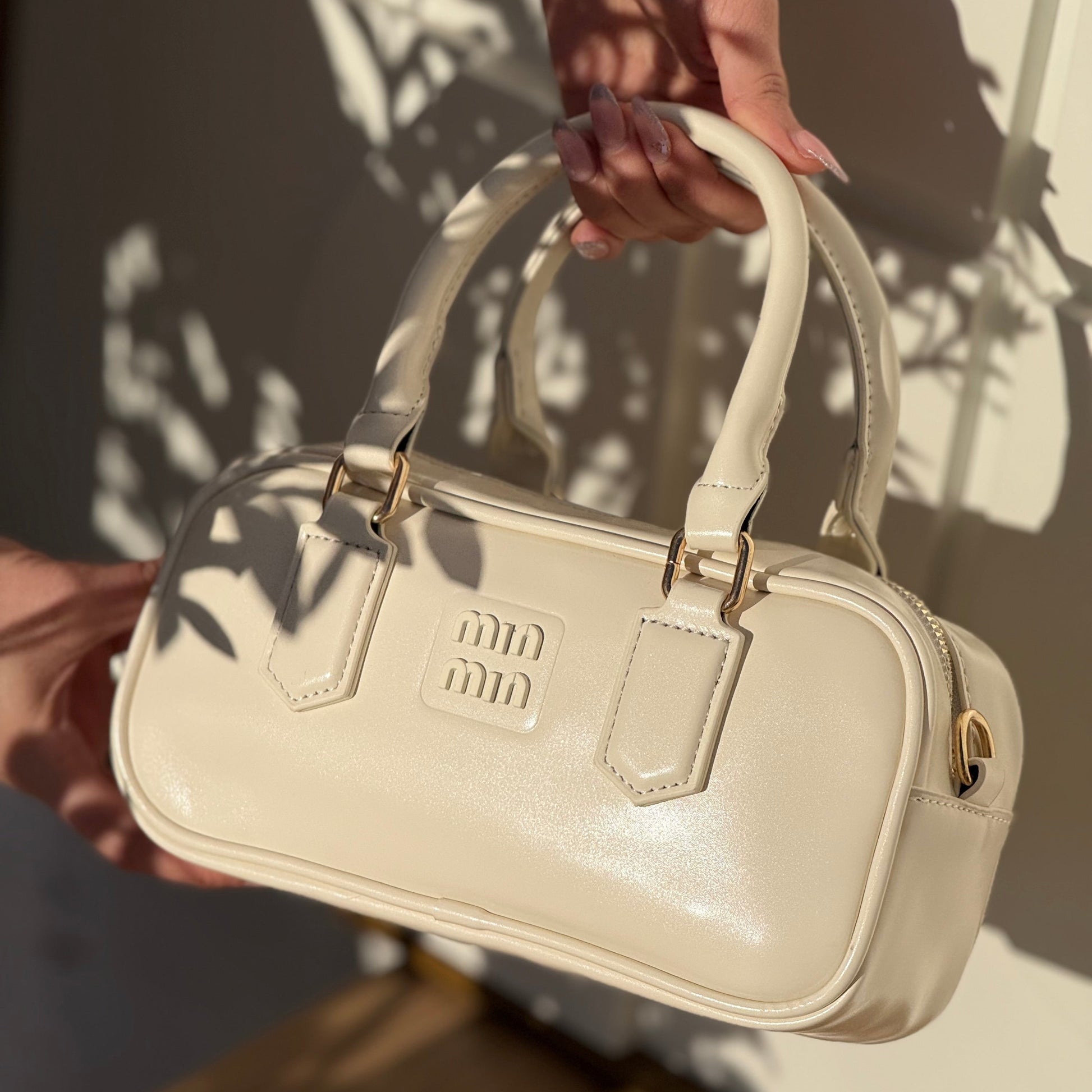 . C’est un sac bowling compact en cuir lisse blanc au design minimaliste.