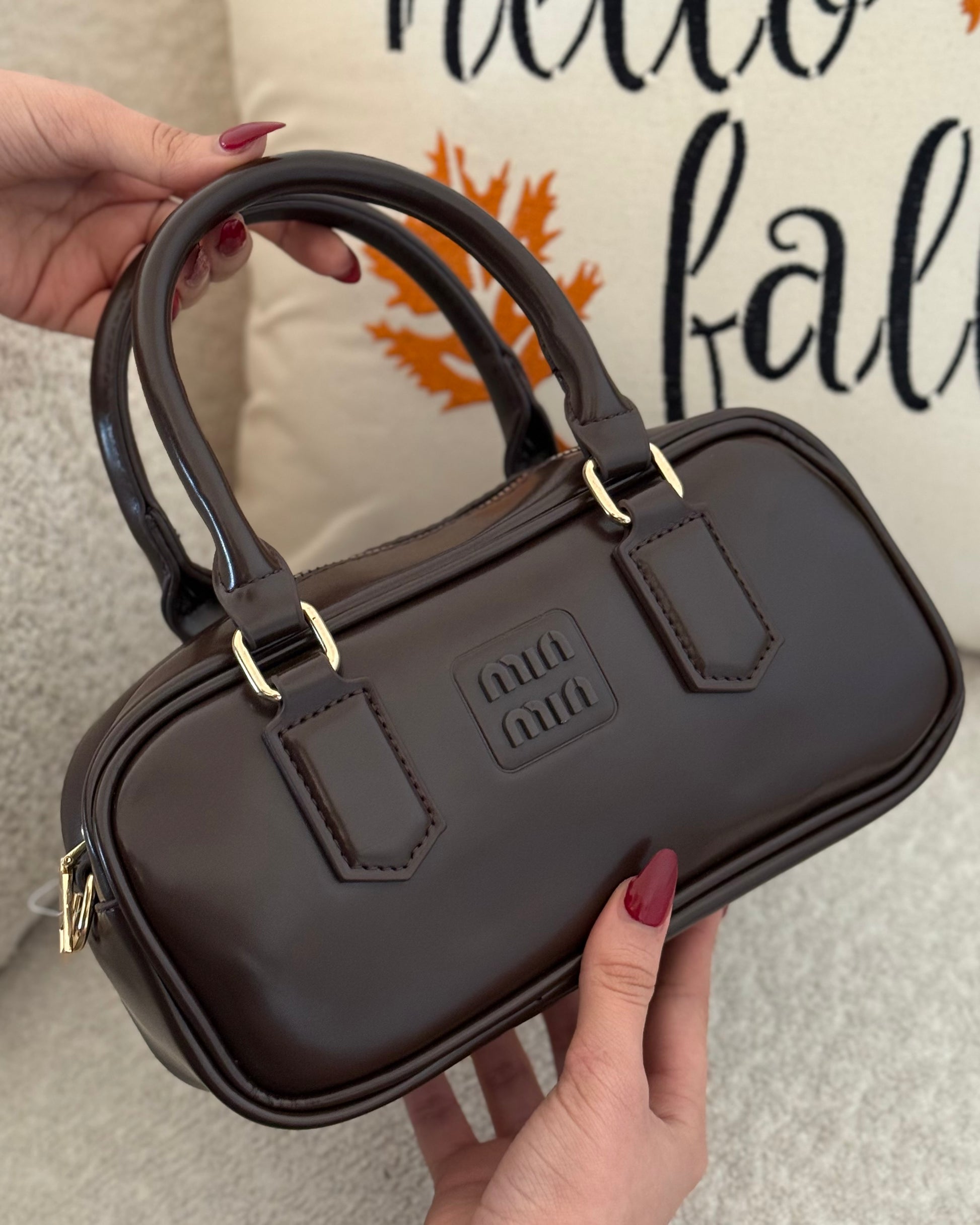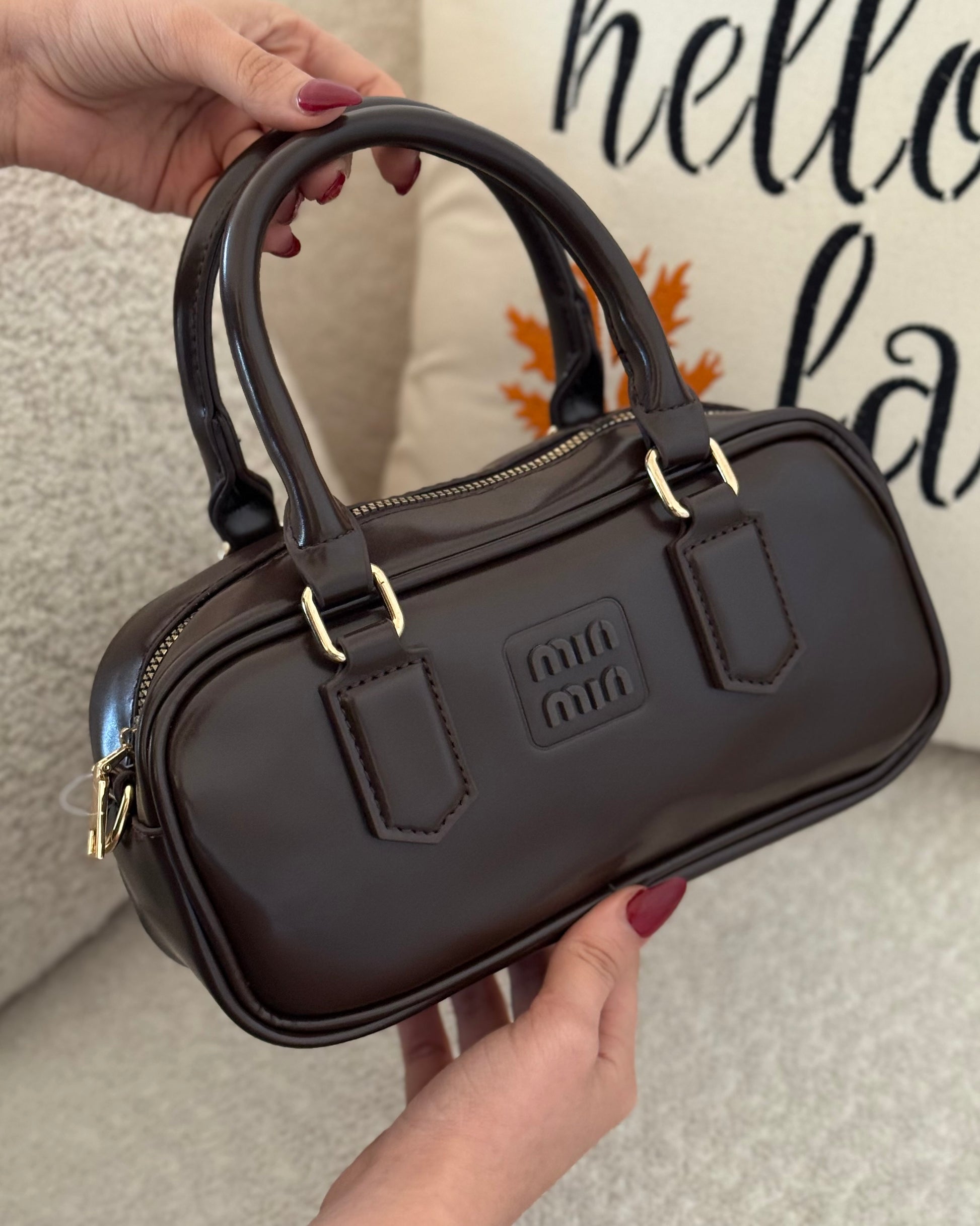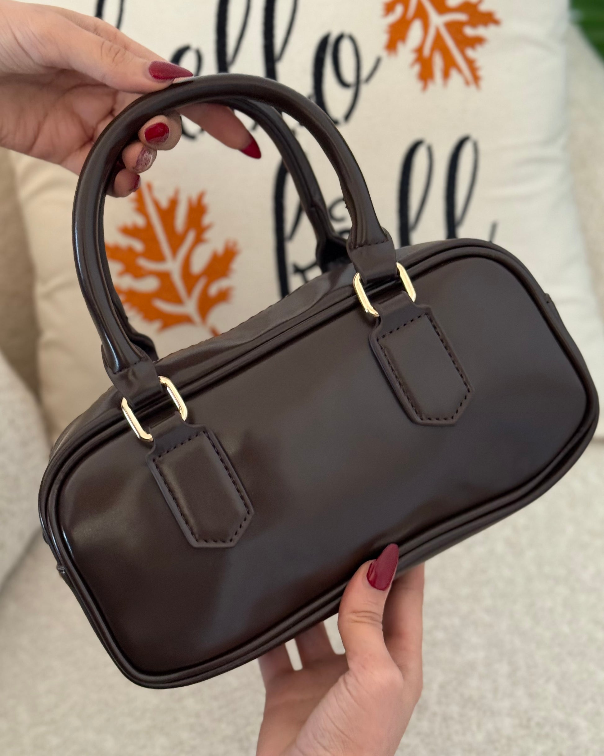 . C’est un sac bowling compact en cuir lisse marron au design minimaliste.
