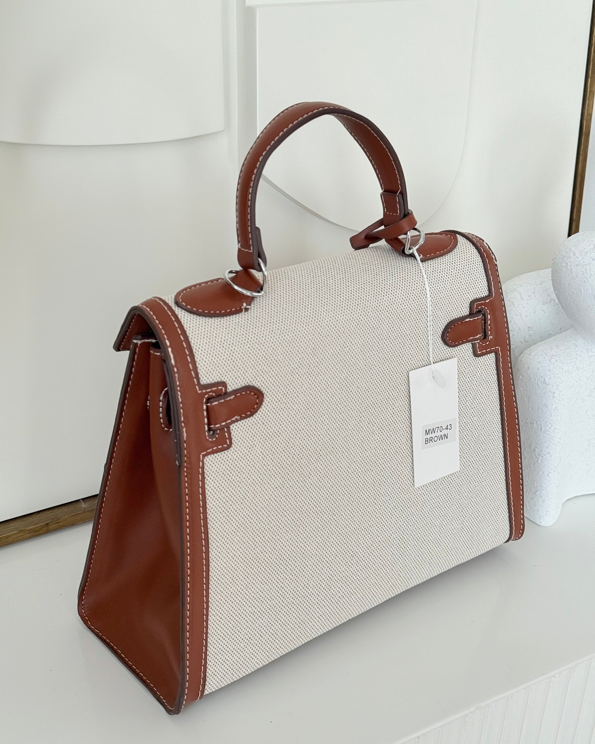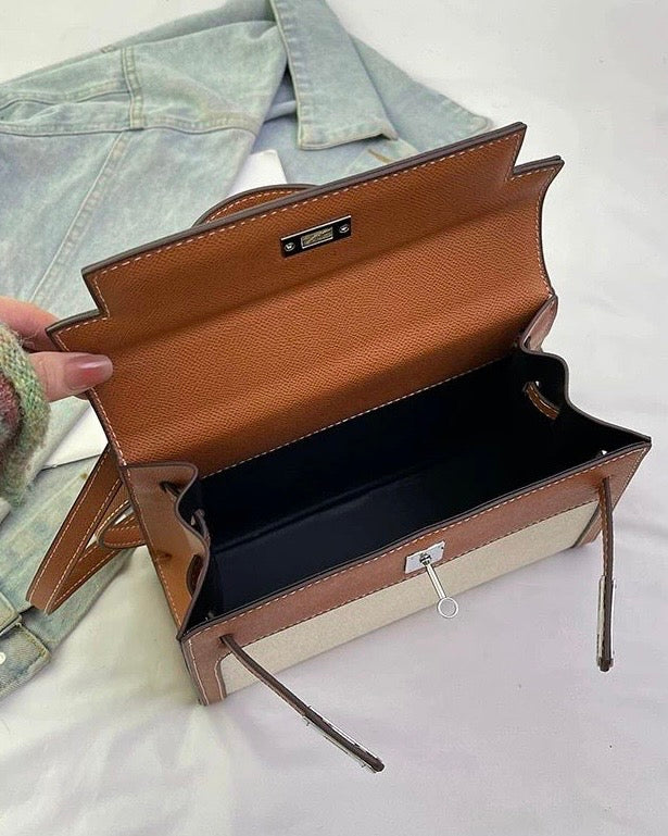✨Le sac Madison marie avec brio le charme authentique de la toile de lin et le caractère noble d'un cuir cognac finement surpiqué.